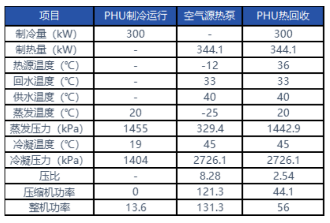 冬季采暖季節, PHU熱回收機組可維持更高的蒸發溫度,利用小壓比壓縮機,以極致的效率產出熱能,整機制熱能效比空氣源熱泵機組有顯著提升,從下面的對比表里可以一探端倪: