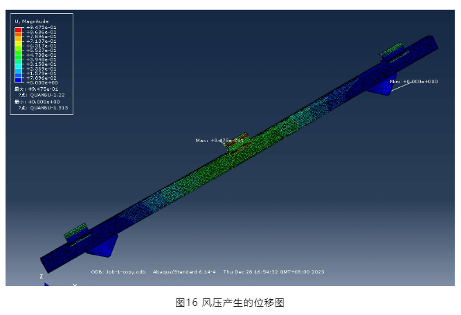 從圖16可以看出,風壓產生的最大位移為0.95mm(特別指出該位移與圖11、12所示位移不同,是因為荷載施加方式不同,圖11及圖12僅為驗證結構體系整體穩定性,因此荷載采取沿橫梁施加線荷載的方式),橫梁截面無翹曲,因此,該創新壓塊節點滿足強度要求。