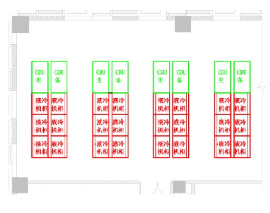 3)將CDU集中布置到一個(gè)區(qū)域或者集中到幾個(gè)有序區(qū)域,使液冷設(shè)備管路和冷卻水管路有明確的物理分區(qū),一方面可以使各功能區(qū)有序布局,另一方面能夠更加簡(jiǎn)潔的實(shí)現(xiàn)冷卻水管路和閥門冗余設(shè)計(jì)。