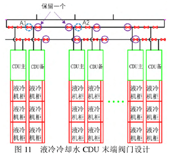 系統(tǒng)改造過程中,需要特別關(guān)注如下幾方面。一是原有冷卻水系統(tǒng)水質(zhì)運(yùn)行情況,如果水質(zhì)運(yùn)行不良,為避免切換到冷凍水作為冷源運(yùn)行時(shí)污染冷凍水系統(tǒng),可以在冷凍水回水管路上增加過濾器進(jìn)行處理后再回到總的冷凍水大管網(wǎng)系統(tǒng)中。二是切換過程中,需要分別核算下液冷CDU分別在冷卻水系統(tǒng)和冷凍水系統(tǒng)運(yùn)行時(shí)管網(wǎng)的壓力大小,兩者接近最優(yōu),如果冷凍水運(yùn)行的壓力高于冷卻水運(yùn)行的壓力,切換過程中重點(diǎn)關(guān)注閥門切換的時(shí)間,同時(shí)要監(jiān)測(cè)好冷凍水系統(tǒng)自身的補(bǔ)水處于正常運(yùn)行工況,避免冷凍水壓力快速下降,影響到自身的運(yùn)行。三是冷卻水管路上的閥門設(shè)置,要避免過設(shè)計(jì)超配閥門,避免不加分析的直接使用傳統(tǒng)冷凍水系統(tǒng)管路的閥門設(shè)計(jì)方式。按照GB50174-2017《數(shù)據(jù)中心設(shè)計(jì)規(guī)范》,末端設(shè)備如冷凍水精密空調(diào)通常按照N+1設(shè)計(jì),也即是有1臺(tái)備用;為實(shí)現(xiàn)運(yùn)行過程中閥門單點(diǎn)故障時(shí)檢修更換,通常末端設(shè)備,會(huì)連續(xù)設(shè)計(jì)2個(gè)閥門,見圖 10[12],當(dāng)其中一個(gè)閥門故障時(shí),可以關(guān)閉該故障閥門左右相鄰的閥門,只需要停機(jī)1臺(tái)設(shè)備,而不影響主用設(shè)備數(shù)量的正常使用。但是對(duì)于液冷系統(tǒng),通常CDU是1用1備,相鄰的一組也是1用1備,兩組CDU之間的閥門,完全可以有原來的2個(gè)閥門只保留1個(gè)閥門;當(dāng)其中一個(gè)閥門故障時(shí),可以通過關(guān)閉A1和A2閥門來實(shí)現(xiàn)隔斷功能,見圖 11。雖然需要停機(jī)2臺(tái)CDU,但2組設(shè)備各有1臺(tái)備用不會(huì)影響到設(shè)備的正常使用。