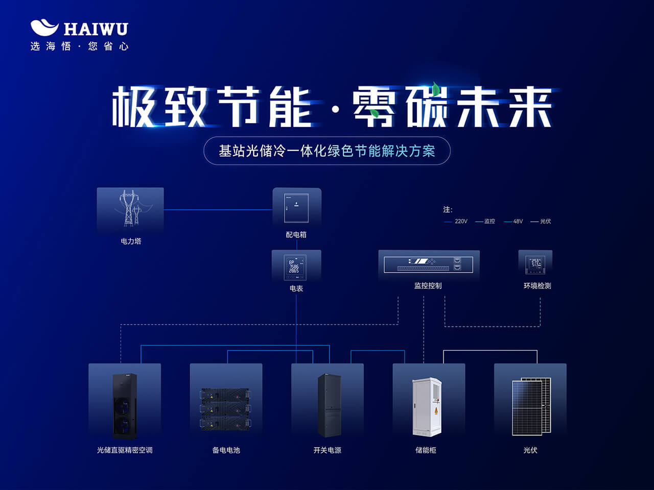 針對5G基站建設中的選址難、能耗高等痛點,海悟推出了基站光儲冷一體化綠色節能解決方案。該方案集成了供配電、電池備電、空調制冷、動環監控及氣流組織管理等核心功能,為基站提供了全方位的基礎設施支持。