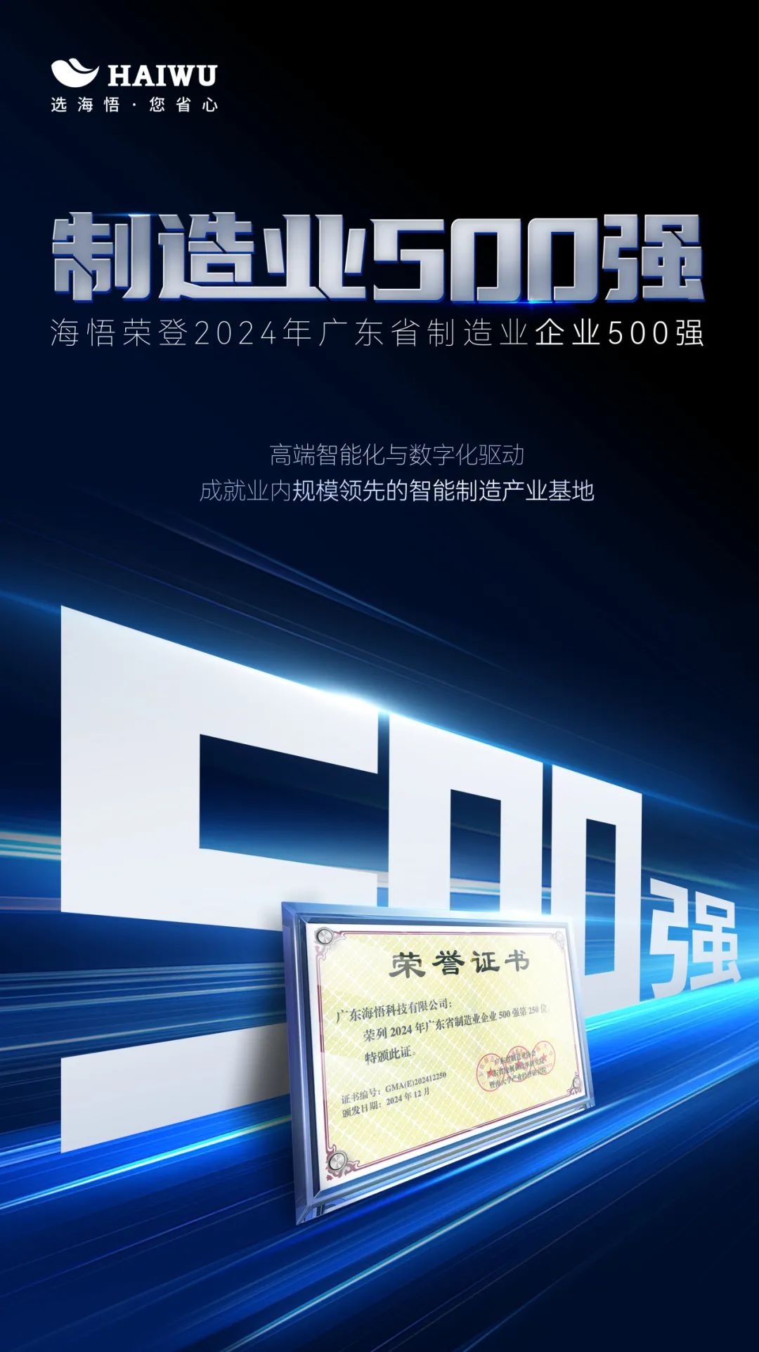 此次榮登2024年廣東省制造業500強榜單,是海悟發展歷程中的一個重要里程碑。展望未來,海悟將繼續秉持創新、品質、責任的發展理念,不斷推動數字能源產業的轉型升級和可持續發展,為構建更加綠色、智能、高效的能源環境貢獻更多智慧和力量。