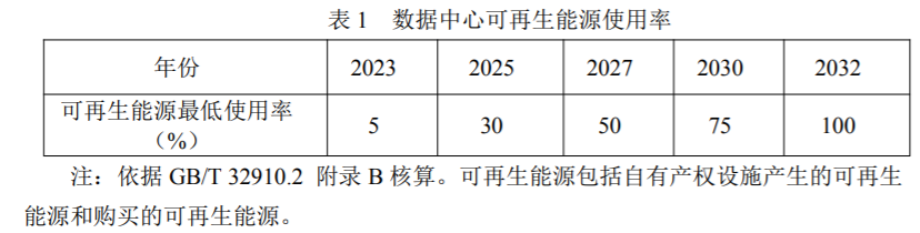 再根據(jù)2023年4月14日,受生態(tài)環(huán)境部和財政部委托,綠色低碳數(shù)據(jù)中心(環(huán)境認證管理技術(shù)中心)和中環(huán)聯(lián)合認證中心共同承擔編制的《綠色數(shù)據(jù)中心政府采購需求標準(試行)》由財政部、生態(tài)環(huán)境部和工信部共同發(fā)布,其中就提及數(shù)據(jù)中心可再生能源使用率如下: