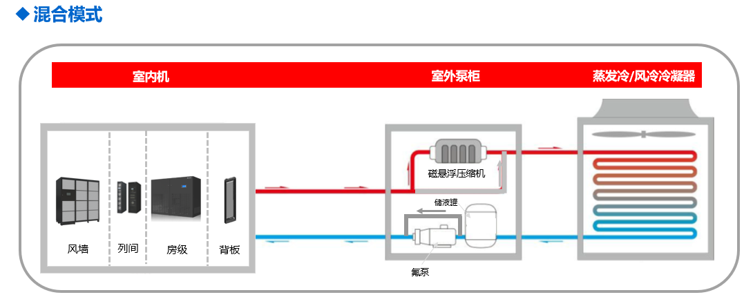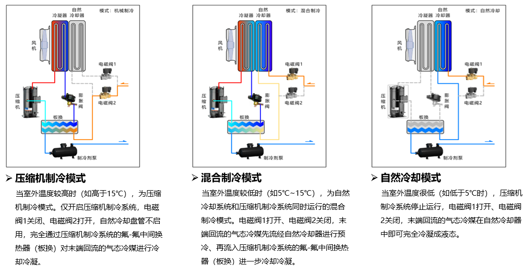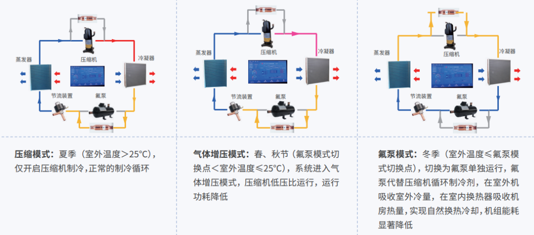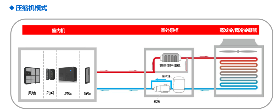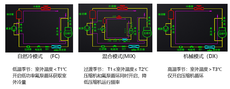 當(dāng)室外溫度低于一定值時(shí),開啟氟泵自然冷模式,此時(shí)壓縮機(jī)停止工作,完全利用自然冷源制冷,大大降低數(shù)據(jù)中心制冷能耗。